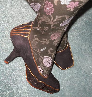 The design on these shoes is wonderful. The fan shape across the heel is the type of detail you would expect to see on vintage shoes while the stitching is very art-deco inspired. Similar in shape to my Candyfloss shoes, they have an angular heel and this squared off, block toe. One of the more wearable styles over the years, for those afraid of the IC craziness!